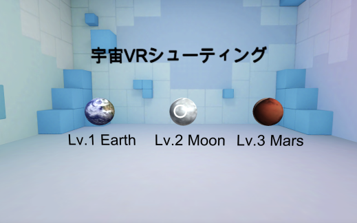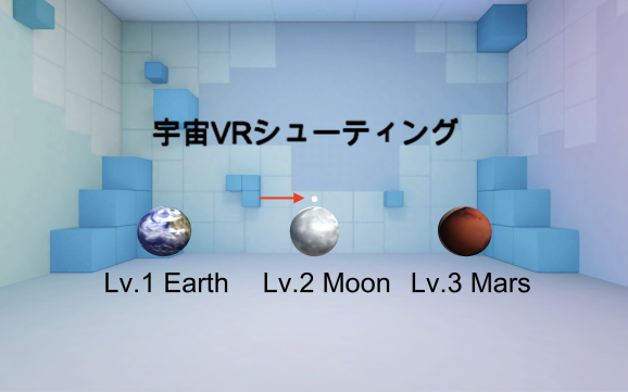 タイトルシーンでは、白いポインターをLv.1、2、3の球体に2秒注視することで対応したゲームシーンに移動することができます。注視できていると右下の画像のようにポインターが○で表示されます。