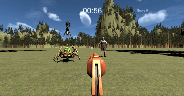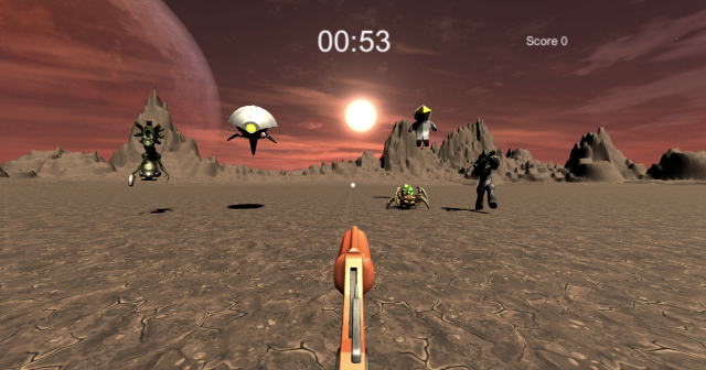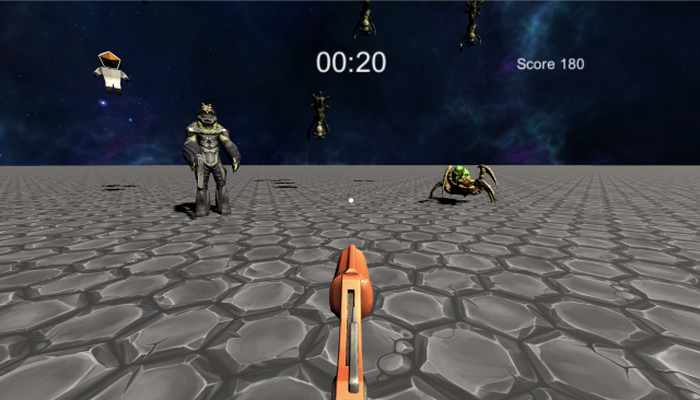 「空間とシューティングゲームを楽しんでもらう」をコンセプトとした携帯VRシューティングゲームです。タイムリミット制のシューティングゲームになっていて、制限時間(60秒)内に多くの敵を倒して高スコアを目指します。