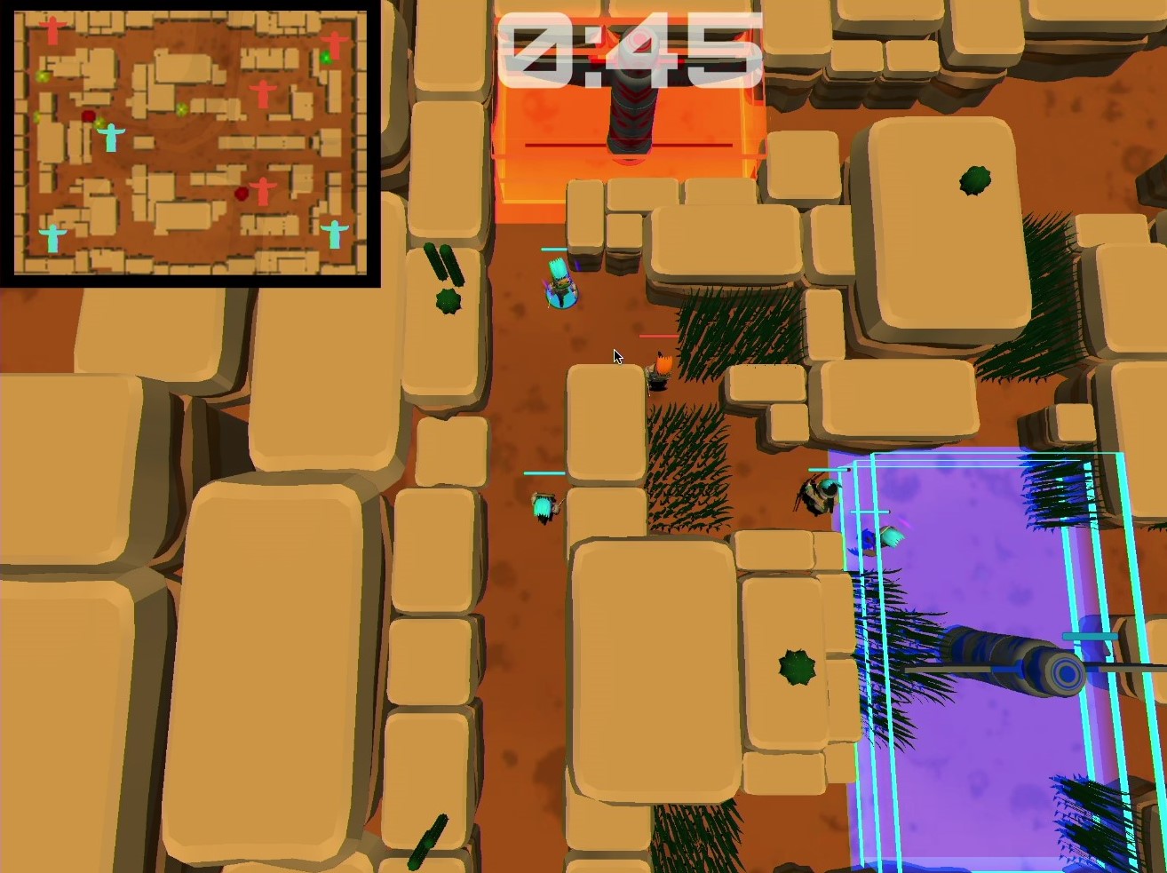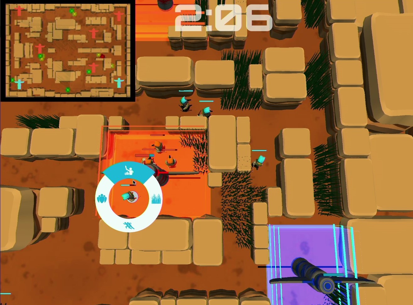 『TAZEBUZE』は複数のユニットを操作し、陣地を取り合うRTS風のゲームです。三分間により多くトーテムがあるエリアを占拠できたチームの勝利となります。 操作するユニットは4種類計10体おり、基本タイプが4体、遠距離タイプ、スピードタイプ、